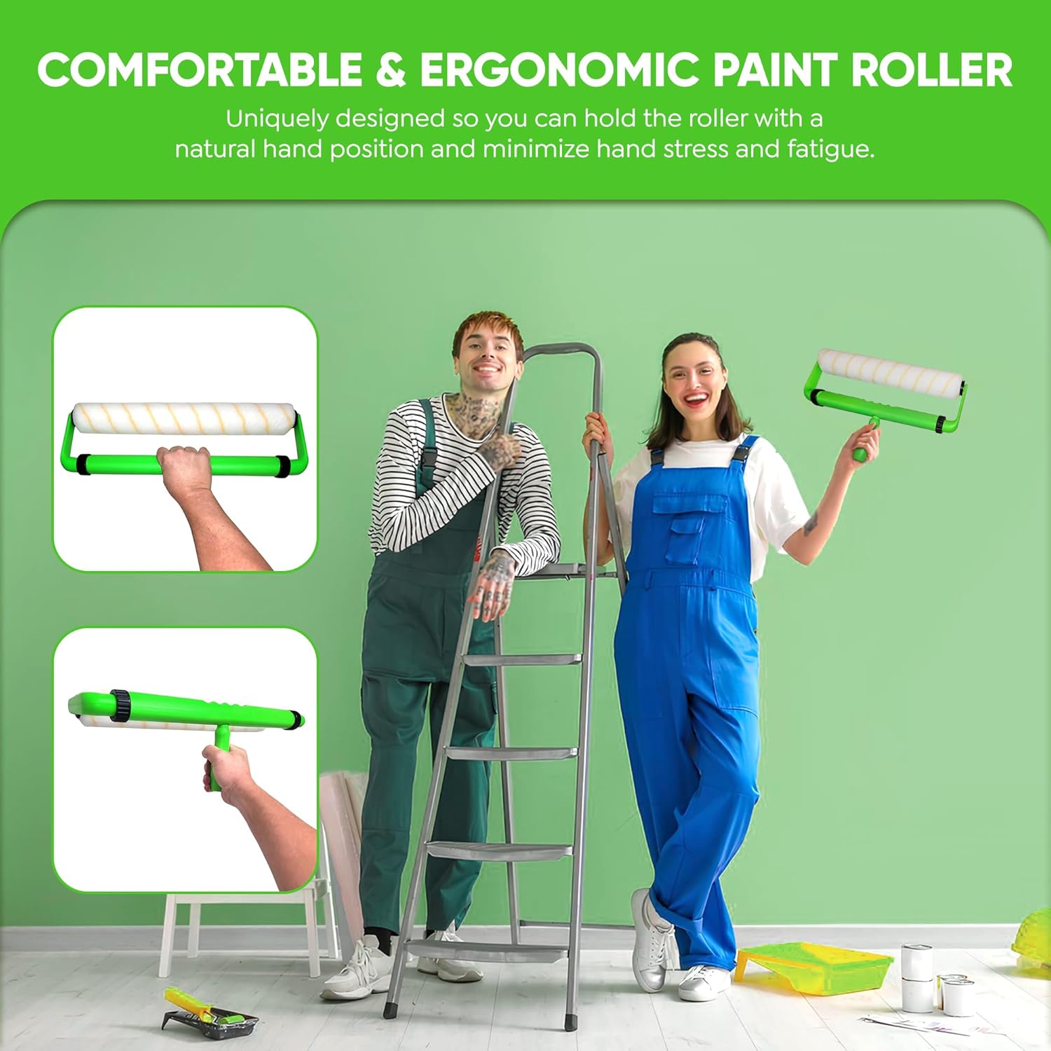 - COMFORTABLE & ERGONOMIC: Uniquely designed so you can hold the roller with a Natural Hand Position and minimize hand stress and fatigue. Paint longer with less soreness!