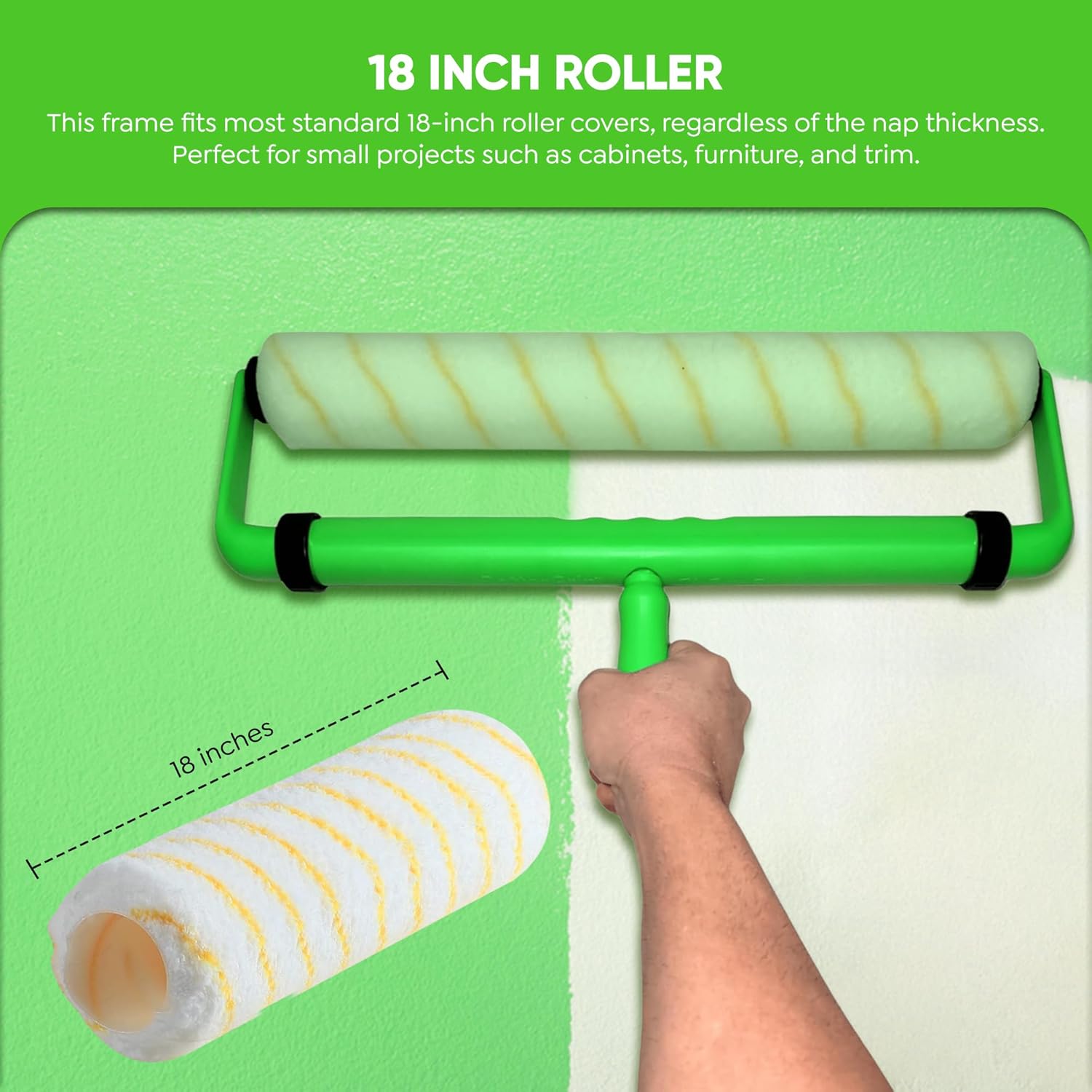 - 18 INCH ROLLER: This frame Fits most standard 18-inch roller covers, regardless of the nap thickness. Perfect for large projects, including painting walls, decks and exterior walls. Adapter handles (sold separately) allow the 18-inch frame to be converted into 4-inch frame for smaller jobs or a 9-inch frame for standard jobs.